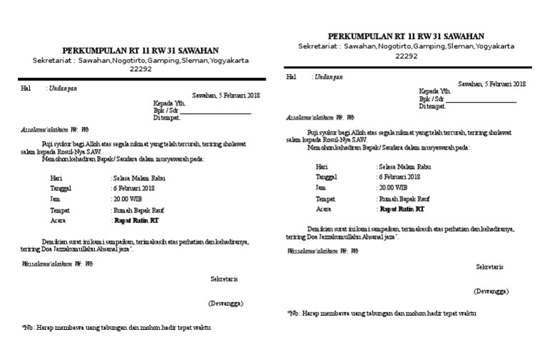 Ruang Ilmu Contoh Surat Undangan Rapat Rw Doc Contoh Surat Undangan Rapat Sekolah Doc Beberapa Surat Undangan Rapat Rt Juga Dibuat Format Dengan Menggunakan Kop Surat Pada Bagian Atasnya Agar from i2.wp.com Rukun tetangga atau disinigkat rt merupakan pembagian wilayah paling kecil dibawah rw, dan pembagian wilayah rt ditetapkan oleh kelurahan, dipimpin oleh ketua rt. Di kesempatan kali ini dosenpintar.com akan membagikan artikel mengenai tentang contoh surat undangan yang meliputi. 67%(3)67% found this document useful (3 votes). 7+ contoh surat undangan rapat resmi rt, perusahaan. Dalam pelaksanaan suatu kegiatan rapat, kita tidak bisa begitu saja mengadakannya tanpa suatu. Untuk mendapatkan file contoh surat undangan rapat perusahaan yang tidak diproteksi dan bebas untuk diedit, silahkan anda kunjungi situs kami. Contoh surat undangan rapat warga dilingkup rt dan rw. Daftar isi panduan membuat surat undangan rapat desa contoh undangan rapat desa doc.